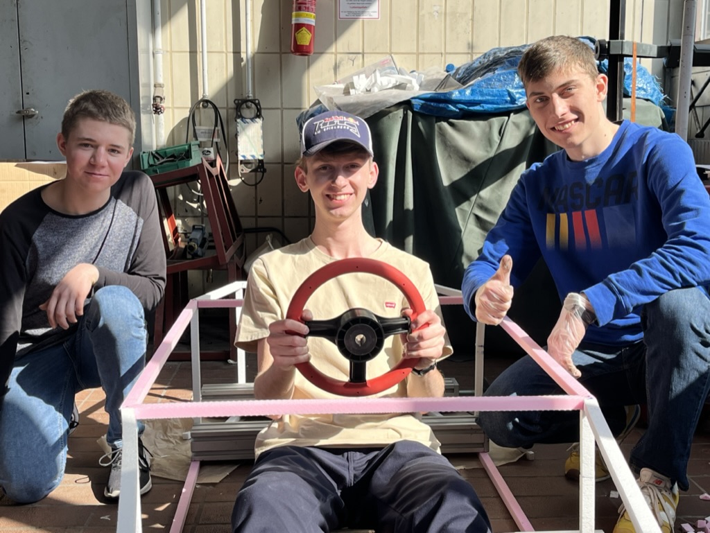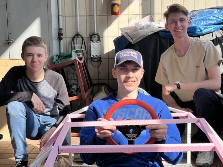 Zwei Gruppen zu je fünf Schülern aus den Klassen 3BHMBZ und 4BHMBZ arbeiten an einem Fahrzeug zur Teilnahme an der HTL – Zero Emission Challenge.