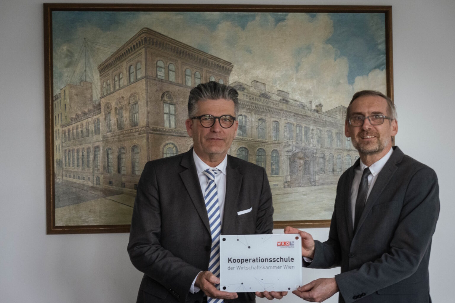 Aus diesem Anlass wurde am 10.5. dem TGM die Kooperationsschulen-Tafel der Wirtschaftskammer Wien überreicht.