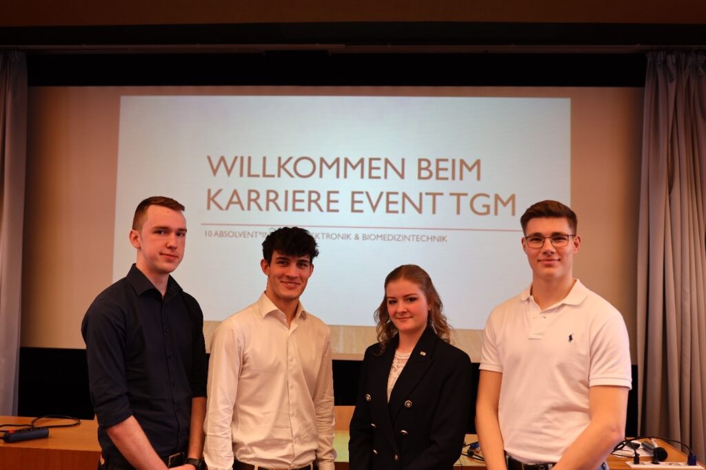 Danach erging das Wort an vier Absolvent*innen, die unmittelbar nach der Matura vor vier Jahren in das Berufsleben eingetreten sind. Sie stellten ihre Firmen (VAMED, Robert Bosch, Zertifizierungsstelle TVFA, Wiener Netze) inklusive der Entwicklungsmöglichkeiten vor, die diese Firmen ihnen eröffnet haben.