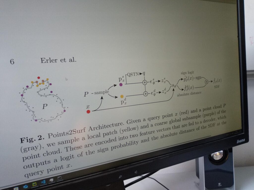 Computergrafik-Forscher Philipp Erler gab eine Einführung in das Thema „Surface Reconstruction„. Hierbei geht es darum, 3D-Objekte aus sogenannten Punktwolken (z.B. das Resultat von 3D-Laser-Scans) in geschlossene 3D-Oberflächen, die aus Polygonen bestehen, umzuwandeln. Letztere können dann in 3D Animationen, Computerspielen und Visualierungs-Anwendungen verwendet werden. Erler ist es gelungen, im Rahmen seiner Dissertation bestehende „Surface Reconstruction“-Methoden mithilfe von fortgeschrittenen KI-Methoden wesentlich zu verbessern.